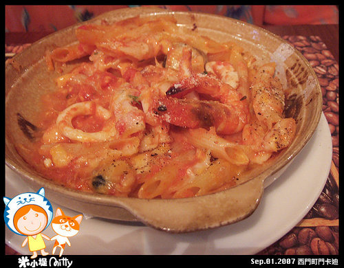 媽咪吃的是海鮮焗烤筆型麵,是茄汁的,
