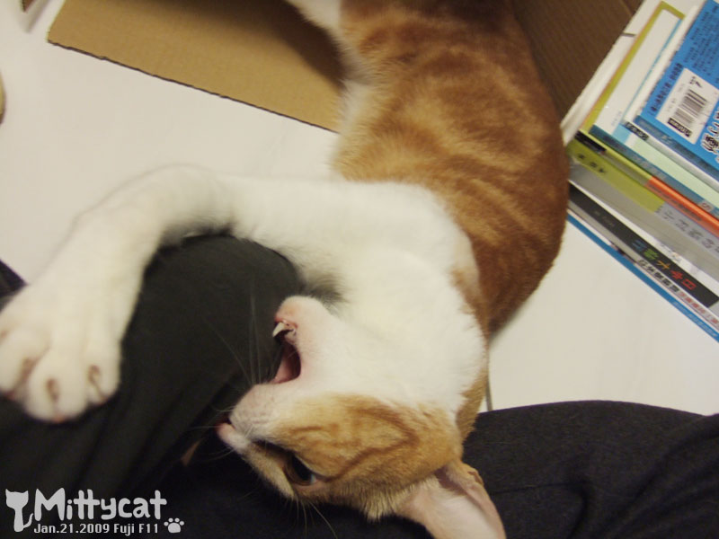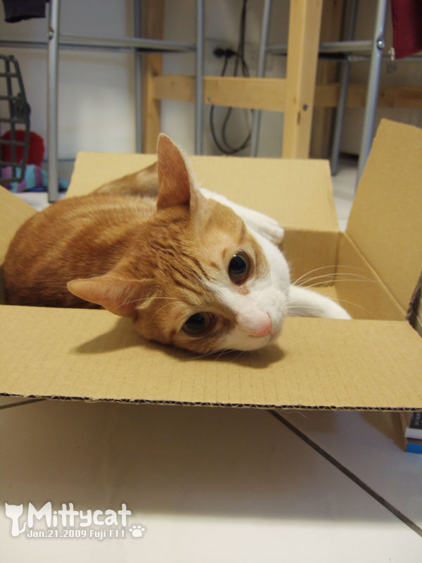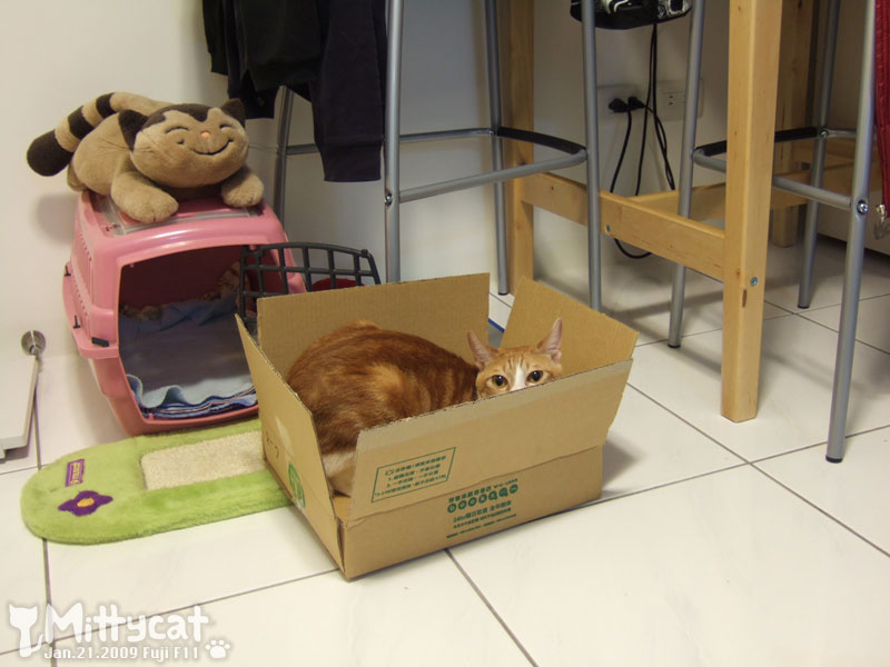 也要從紙箱裡偷看我,深怕我和他搶紙箱